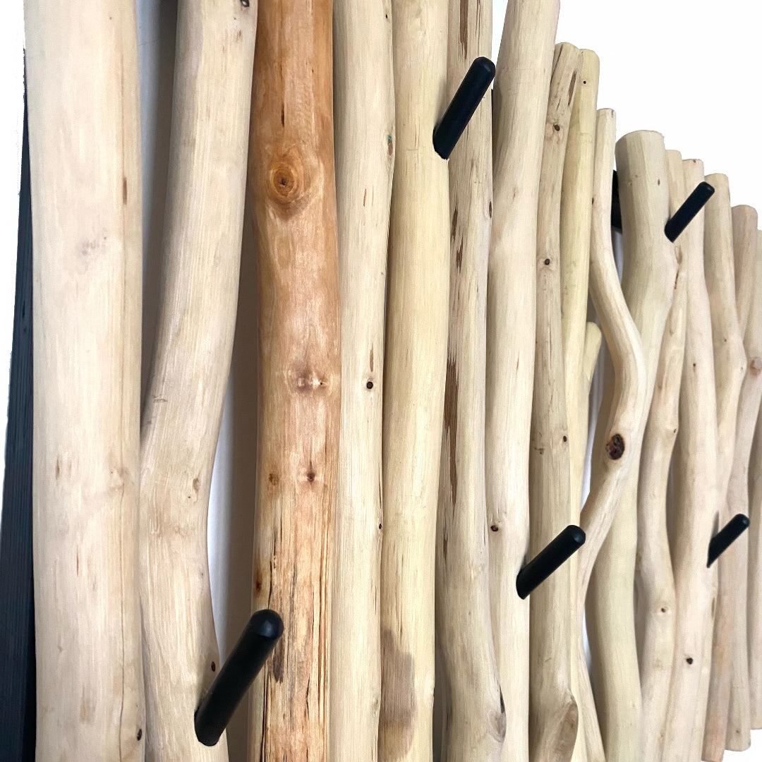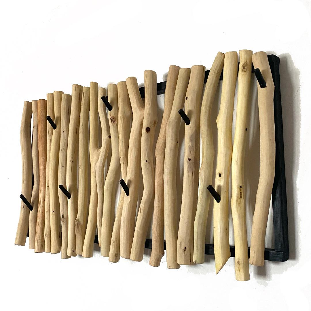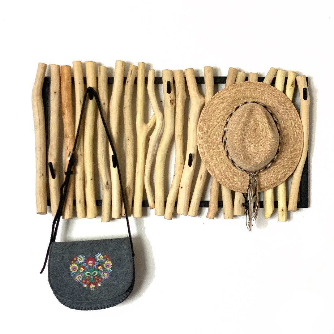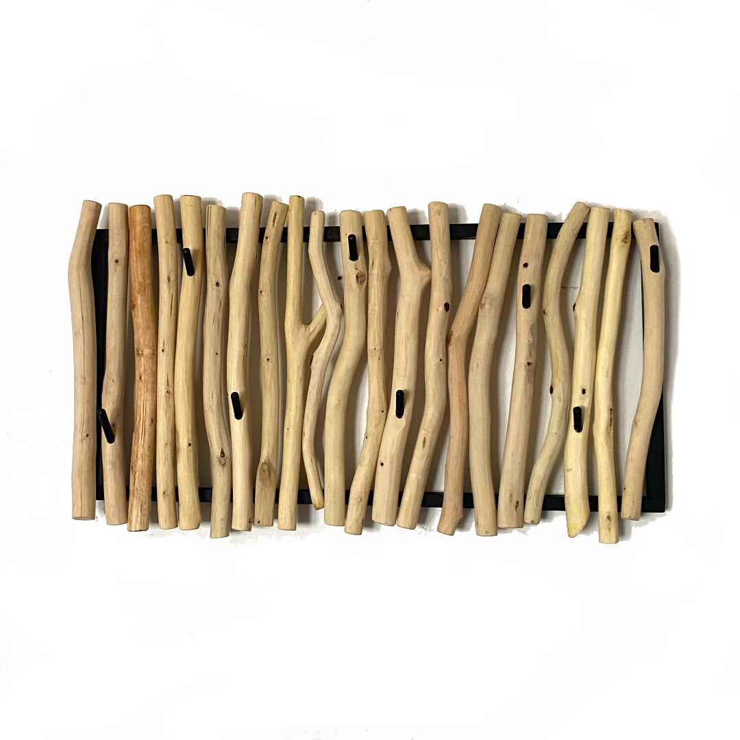 Dřevěný rám, opracované větve a kovové tyčky věšáku.