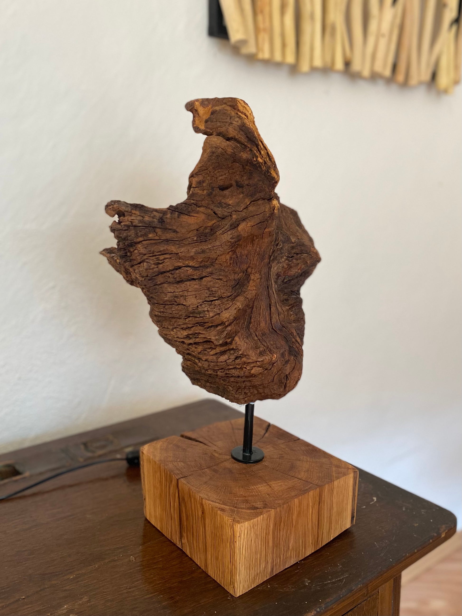 Originální svítidlo ze starého kořene stromu s masivním podstavcem a designovou žárovkou.