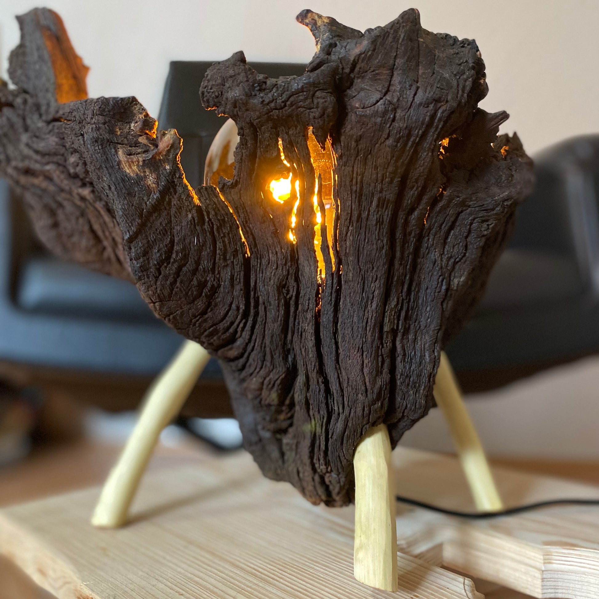 Originální svítidlo ze starého kořene stromu s designovou žárovkou.
