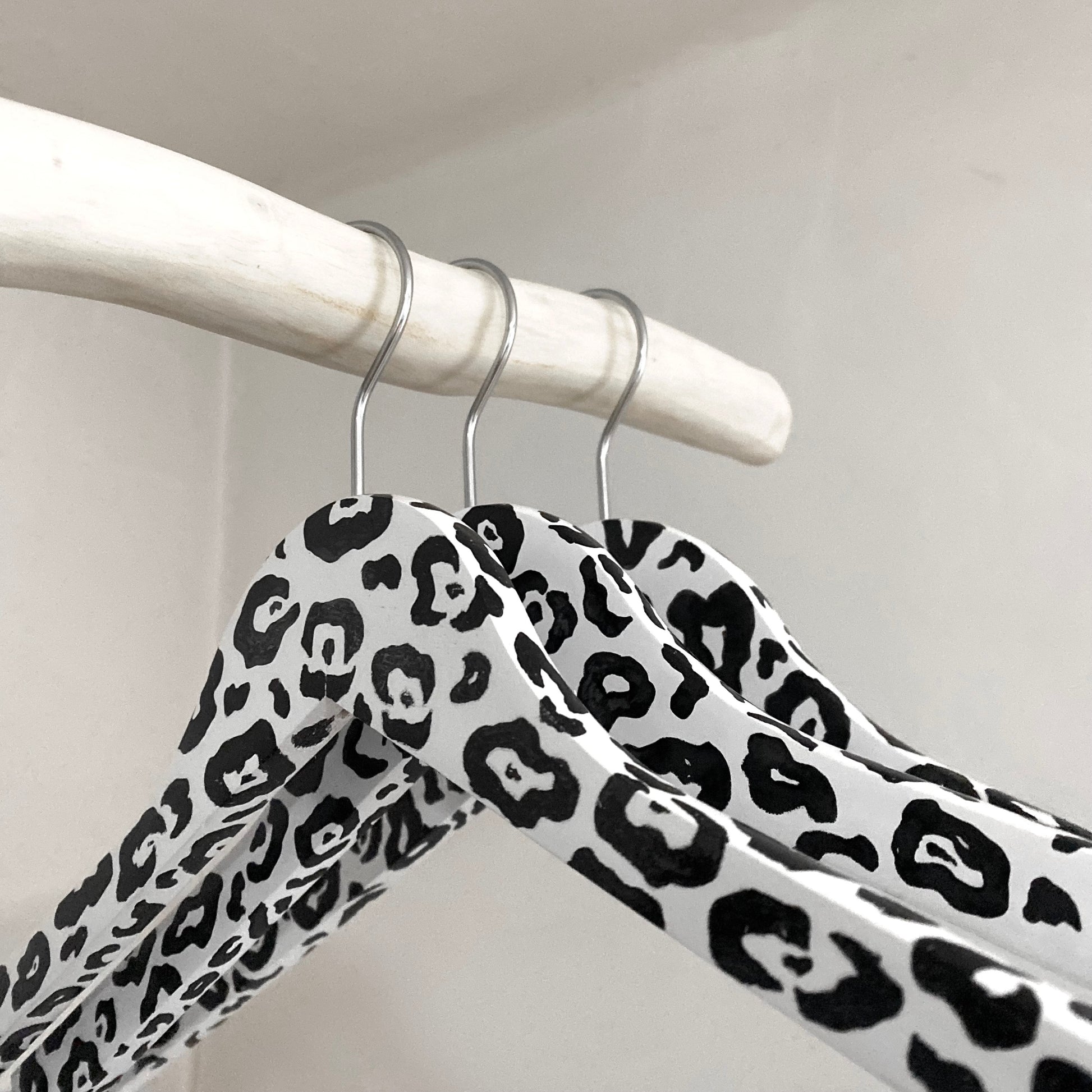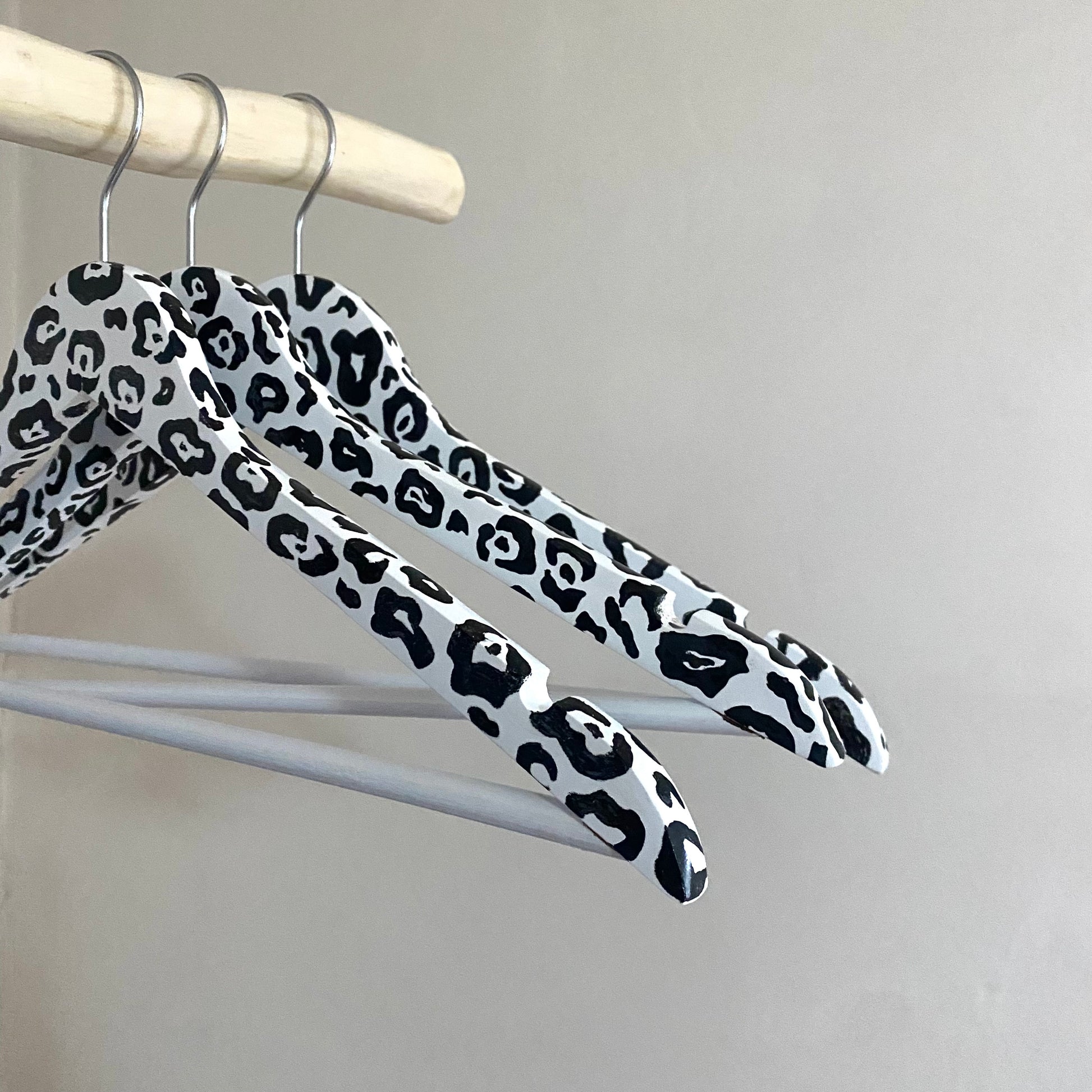 Oboustranně ručně malovaná ramínka s leopardím vzorem, černobílá.